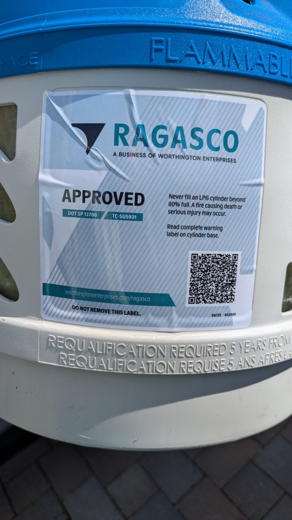 Contrary to some online reports, the tanks were of fairly recent vintage (September 2025) so we’ll get most of the 15 years of life out of them. Each weighed about 9.1 lbs empty and 19.8 lb full. Annoyingly, our local U-Haul franchise wouldn’t fill them even though we purchased them from U-Haul. Zamzow’s Lawn and Garden filled them without hesitation. I think most places will fill them, I’m not too concerned.