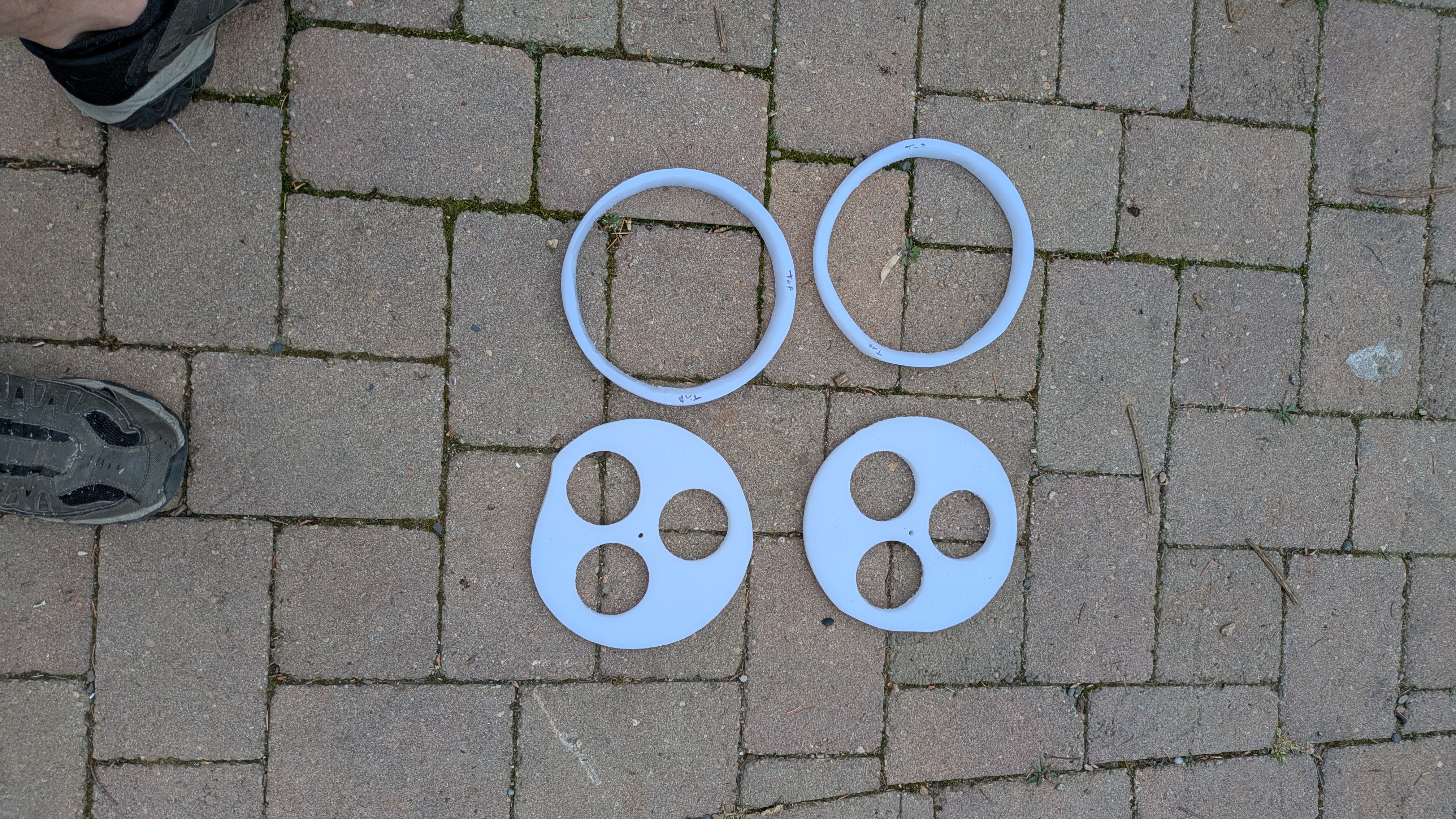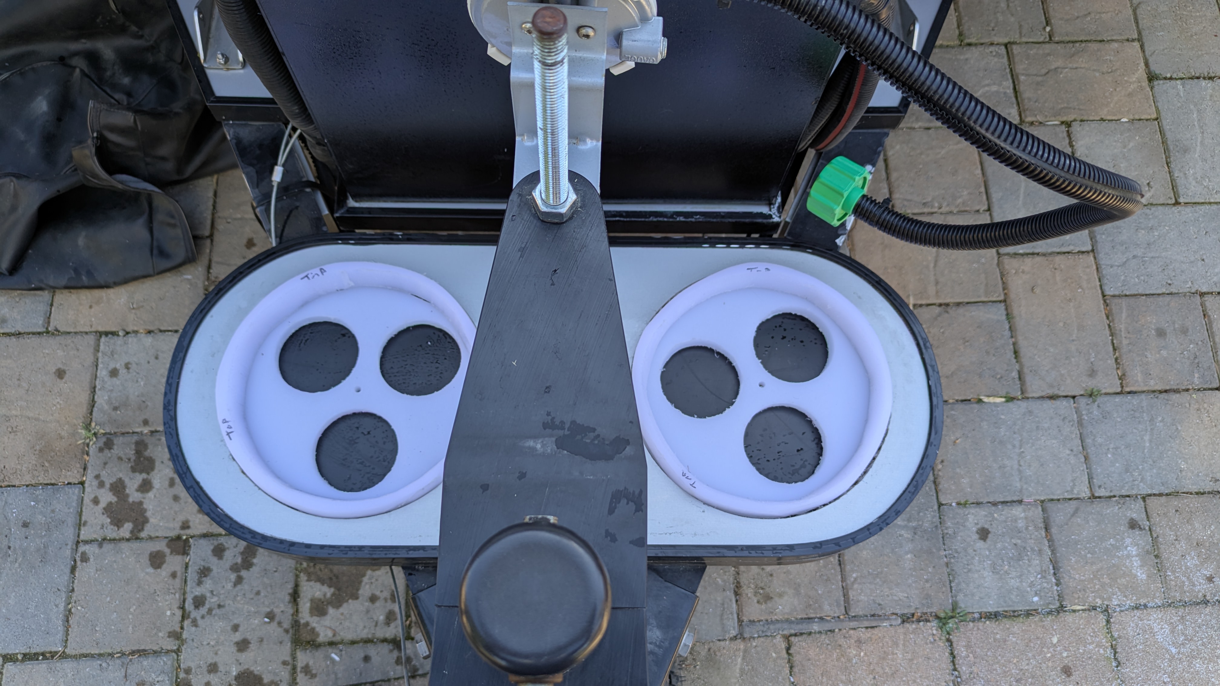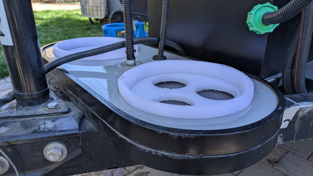 To position / retain the composite tanks horizontally I used some HDPE cutting board material to build up the base and provide a ring that fits inside the tank recess. Actual cutting boards were cheaper on Amazon than the equivalent raw HDPE material. The base piece of HDPE is 1/2″ thick, 8 1/4″ diameter and the ring HDPE is 3/4″ thick with 8 1/4″ outer and 7 1/2″ inner diameter. The ring hits the upper aluminum portion of the base squarely and the fits inside the recess of the tank, preventing the tank from sliding too far side to side (there is a little bit of slop). I cut the circular base and rings with a jigsaw. I cut some holes in the base HDPE with a hole saw bit to save a little weight. Total additional weight from the HDPE is 1.8 lb.