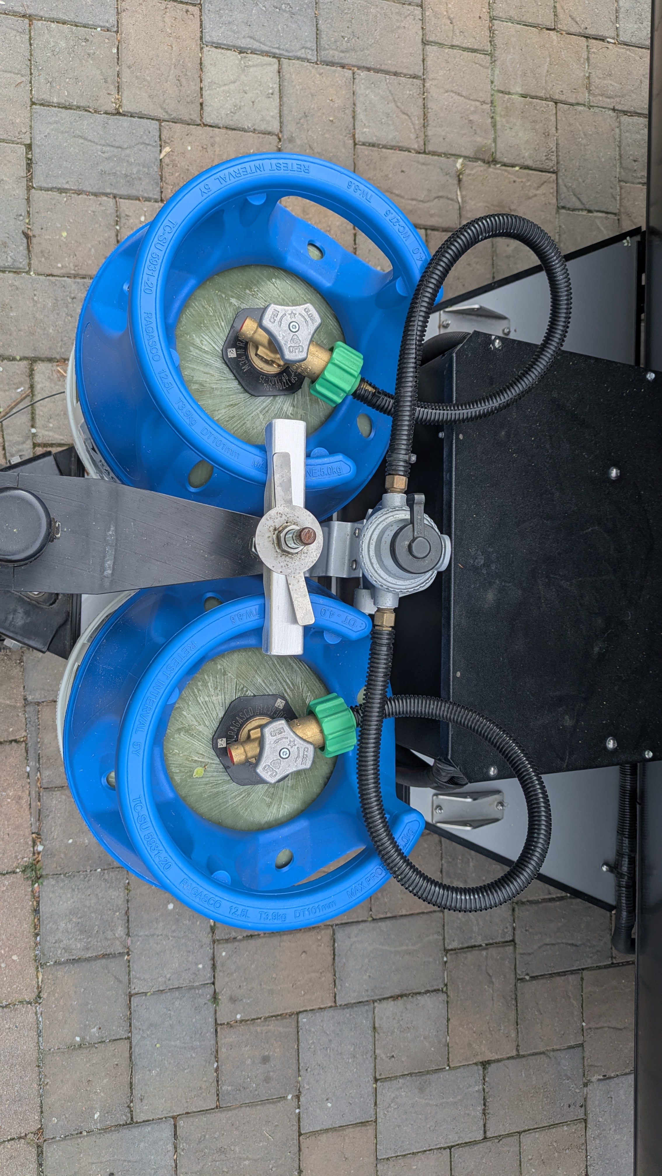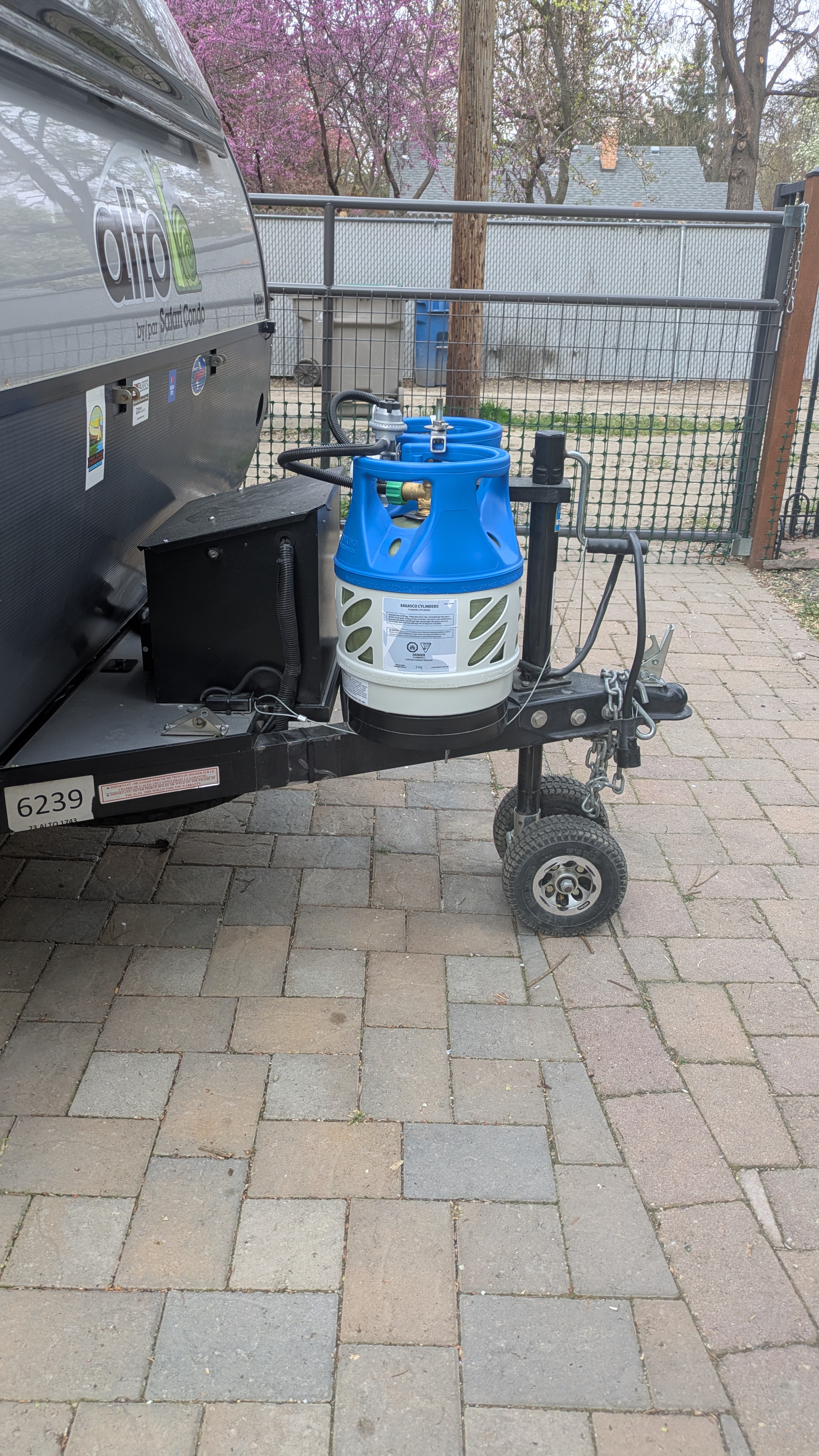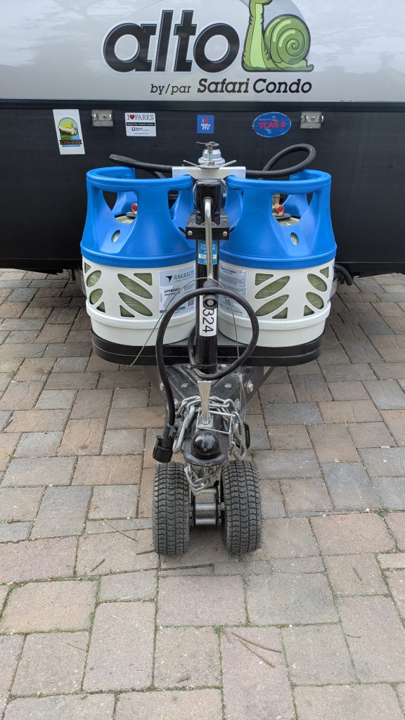 Our Safari Condo (SC) Alto F1743 trailer came with dual 20 lb steel propane tanks. For our style of travel we were carrying around a lot more propane than we actually need. The Truma Combi heater is pretty efficient and we have a 12V refrigerator. Switching to smaller 11 lb composite tanks provides a little more propane than a single steel tank while retaining the operational advantage of two tanks (tank empties, switch to full tank, refill empty at leisure). And it shaves over 35 lbs from the trailer, most of it directly off the tongue. Not coincidentally this is about the weight of a recumbent trike that may or may not wind up in that position.