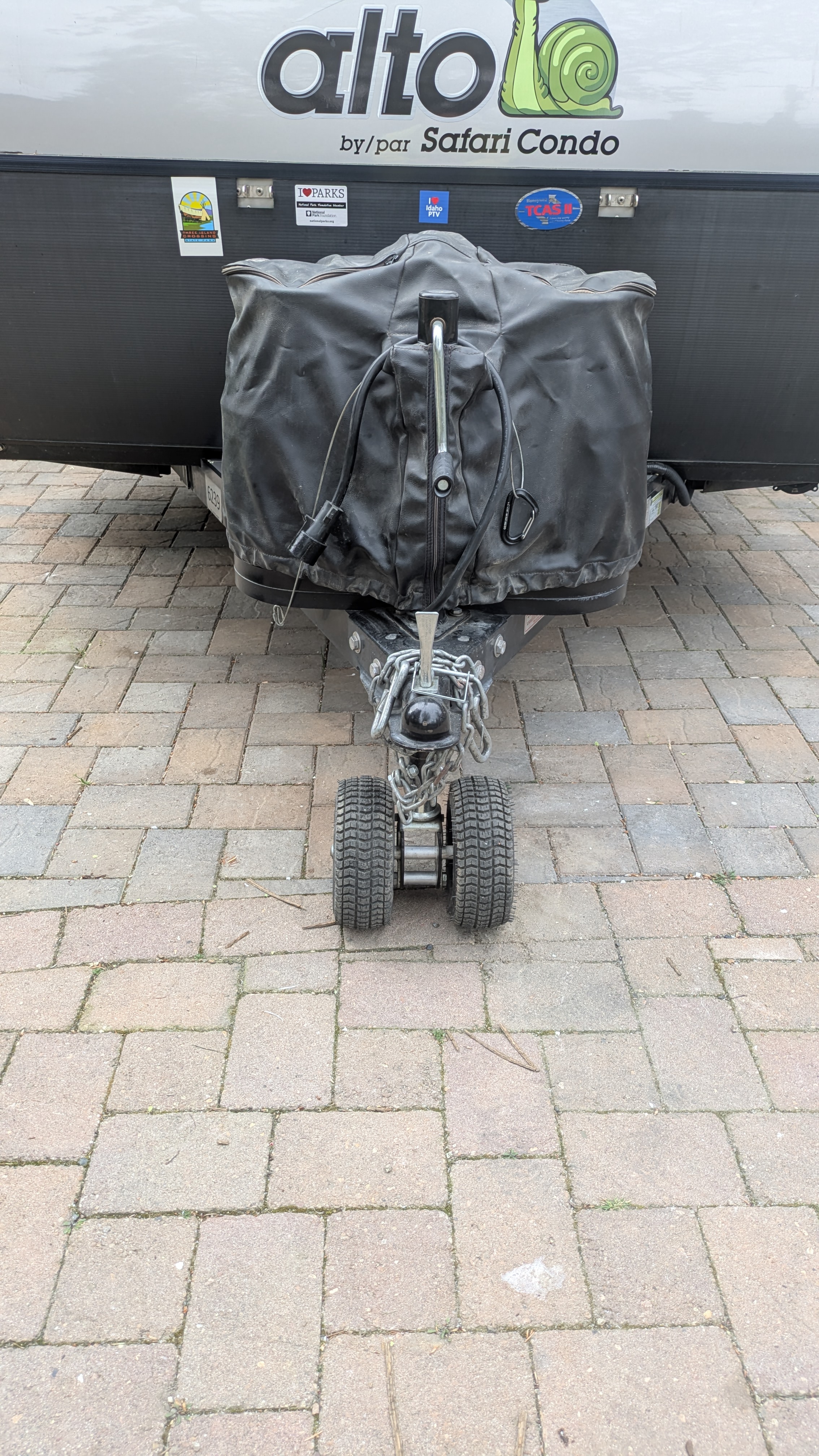 The trailer came with a Reese weight distribution hitch. I didn’t use it on the initial trip home from where we purchased the trailer in Michigan because the bottom portion was too close to the ground when connected to our tow vehicle, a 2023 Tesla Model Y Long Range. It could be made to work by lopping off the unused bottom portion of the hitch but I plan to remove it. WD hitches work by transferring weight from the rear axle of the TV to the front axle and trailer. This can indirectly help address trailer sway by improving traction on the TV front steering wheels. But WD hitches add stress to the TV frame, something many car manufacturers discourage, and don’t directly address trailer sway. With trailer GVWR less than half the weight of the tow vehicle and hitch weight less than 350 pounds, the benefits of WD are likely minimal and come at a high cost in terms of weight and complexity. Complexity in hitching/unhitching is a bigger deal with an EV since many chargers require dropping the trailer and we’ll be stopping more often than with an ICE TV. This is one of the reasons we chose one of the lightest trailers available, we plan to take advantage of it.