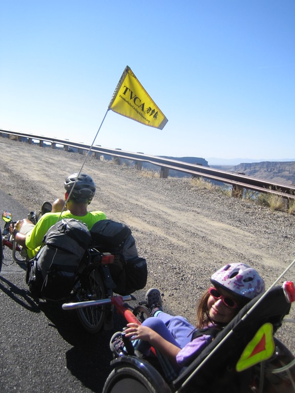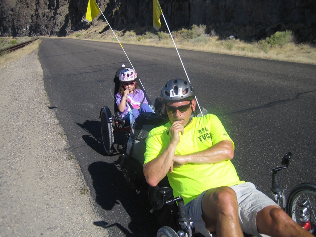 It’s when I started riding trikes that the trouble began. Zoe was still at prime tagalong age and my first trike, homebuilt from the classic Thunderbolt design, had a beefy rear rack. So of course I attached the Picolo tagalong and away Zoe and I went. It wasn’t long, however, before we realized this was a very bad idea. One day we were traveling in downtown Boise when I took what I thought was a very conservative right turn onto a cross street. This time both Zoe and I wound up skidding along on our sides down the center of a busy street. We don’t talk about this with Mom.