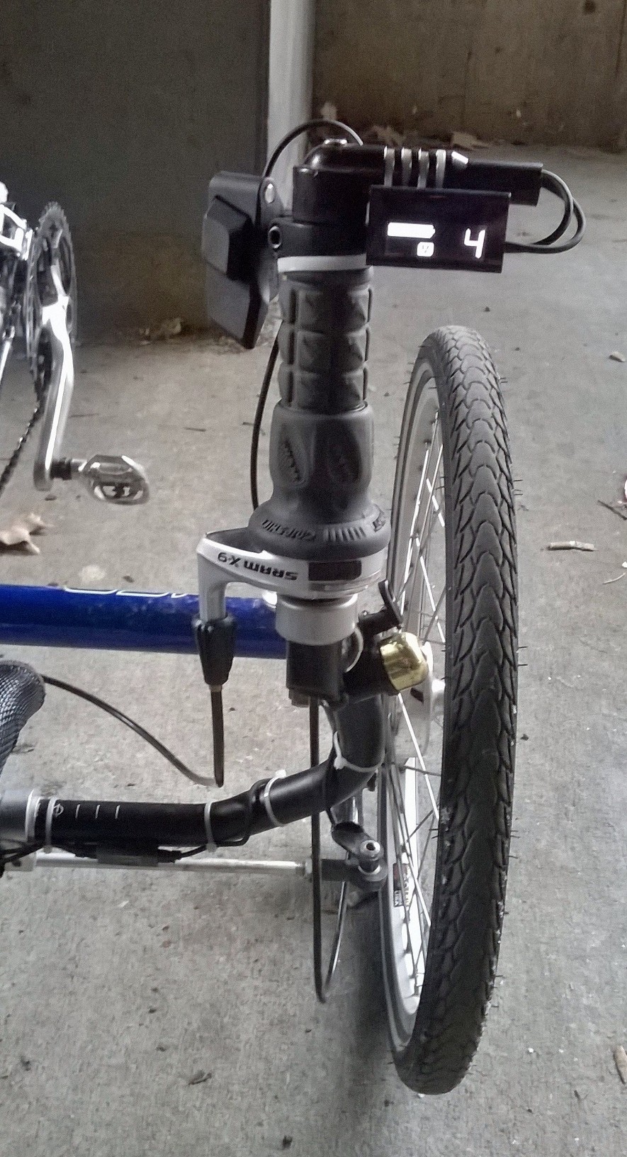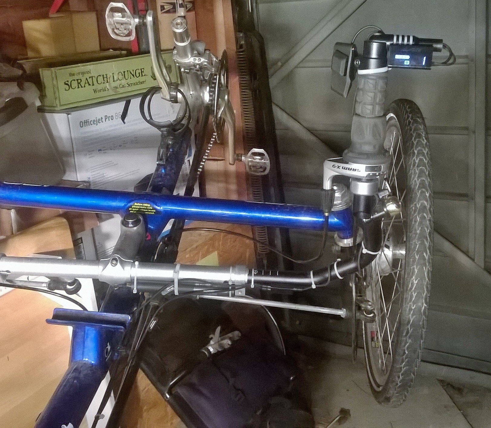 The shifter and mirror are mounted as I expect they will be in their final configuration except that the shifter wire will run inside the handlebar tube. A 1200mm Di2 wire connects the motor to the junction box, located on the black horizontal section of the handlebar near the first bend upward. A 650mm wire connects the junction box to the display. The 1200mm wire is barely long enough to pull this off and the 650mm wire is quite a bit too long, but it will work until I do a more permanent installation. The junction box has one unused connector which is plugged.