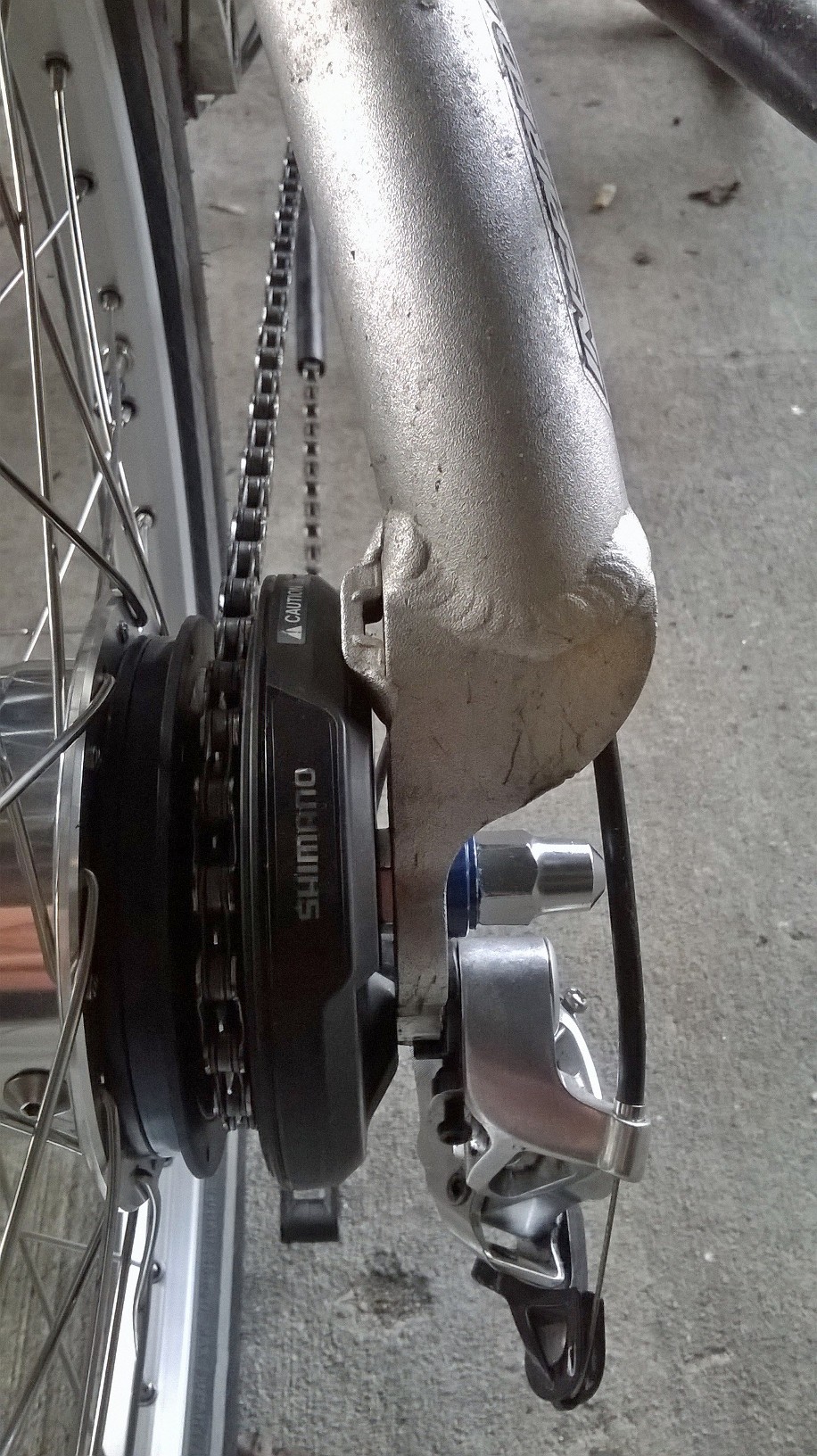I had one surprise when mounting the Alfine wheel onto the ICE Q rear dropout. A tab used to route the rear shift cable interferes with the Alfine motor. I considered grinding it off– it’s intended for a derailleur with front cable attachment which I don’t use– but decided it won’t hurt anything for a temporary installation. If I end up keeping the Alfine on this frame I probably will grind it off.