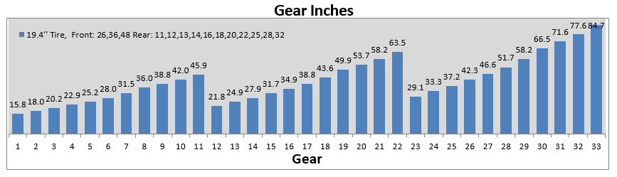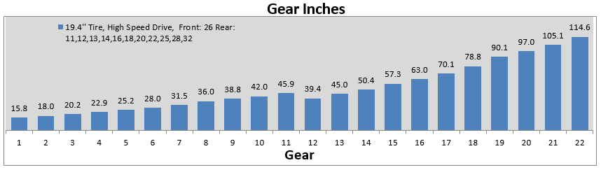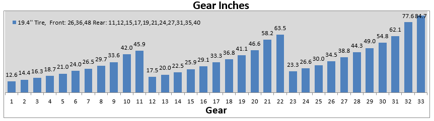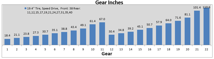 The range is actually a lot better than what you have now (ICE Q with 9-34 cassette)– about an extra gear’s worth with smaller steps between gears (road steps instead of mountain bike steps). This happens because the Schlumpf High Speed Drive is such a big jump that it almost eliminates gearing overlap. The only down side I see is that I probably can’t stay on the low 1:1 gear on the Schlumpf for an entire commute. I might consider shifting up 2 or 4 teeth on the front chain ring to help with this, I don’t need gearing down to 16 GI. The cool thing about a single chain ring in front is that it’s really easy to shift your range up and down to wherever you want it– no 20″ drive wheel penalty.