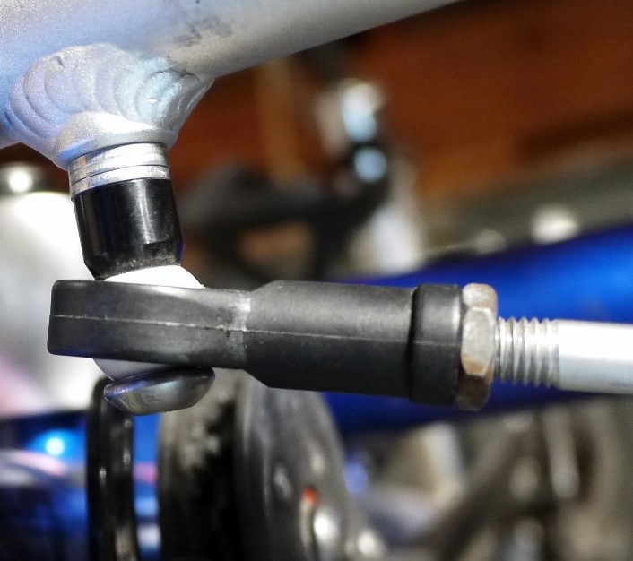 About the time I finished the tour across the US I began noticing a chattering noise while turning. This was easy to track down to the rod ends on the steering push rods. They had a significant amount of play, easily demonstrated by moving the front of the wheels toward and then away from each other. I assumed the play was the result of wear in the metal rod ends so I lifted the seals and packed the joints with grease. This helped for a short while, then I was back to the chatter. So I replaced the ball ends and, to my surprise, there was still about the same amount of play, and they still chattered. Even more surprising was that my brother’s Q had similar play but no chatter. Hmm. Come to think of it, I’d never noticed my trike’s chatter before finishing the big US ride.