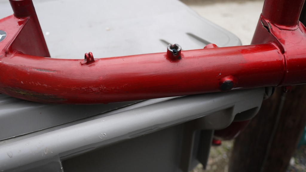 When I was preparing for our ride across the US, I disassembled and inspected the entire trike. All except for two components: The bushings in the rear suspension pivot (more on that later) and the idler. Over the years I had been remiss in not cracking the M8 bolt that holds the idler to the frame. It had seized. In a past life as owner, pilot, and mechanic of a small private airplane, I had much experience in stuck bolts. At one point I fancied myself a bit of an expert on the subject, but I was no match for this thing. After eventually stripping the head of the bolt and breaking off an easy-out, I took the cruciform to a local metal shop and let them have at it. I was horrified when the mechanic pulled out a welding torch and heated up the frame around the stuck bolt. But it worked, without overly damaging the threads in the frame boss. I cleaned up the resulting mess, buffed it out with sandpaper and steel wool, and repainted the damaged area with a poor approximation of the original red. It didn’t matter, it was impossible to see behind the idler, chain, cables, etc.
