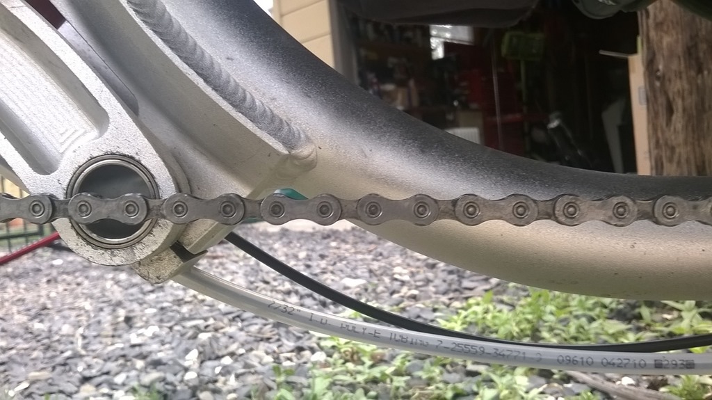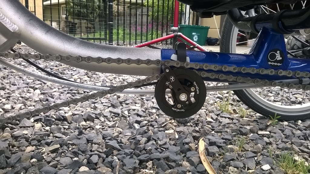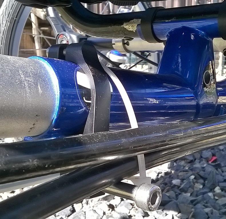The crazy-long chain is perhaps the Achilles heel of recumbents, a situation I lament in my post about recumbent belt drive. In certain conditions it represents a large swinging mass that can wreak havoc on the drivetrain. Trike designers deal with this problem in different ways; ICE’s is to dampen the movement with chain tubes. Under power/load, the drive side of the chain isn’t an issue because it’s under tension, but the return side is a slack, swinging sack o’ potatoes. ICE managed this on my Q by pulling the return line up near the frame with a short piece of fabric that hung off one of the derailleur cable stays. The fabric looped around the chain tube. Simple and effective. But in the transition to the Franken-trike I call the HDQ, where the old, broken Q cruciform was replaced with an Adventure HD cruciform, the geometry was different and I couldn’t use that piece of fabric. I simply omitted it and never looked back, until Di2.
