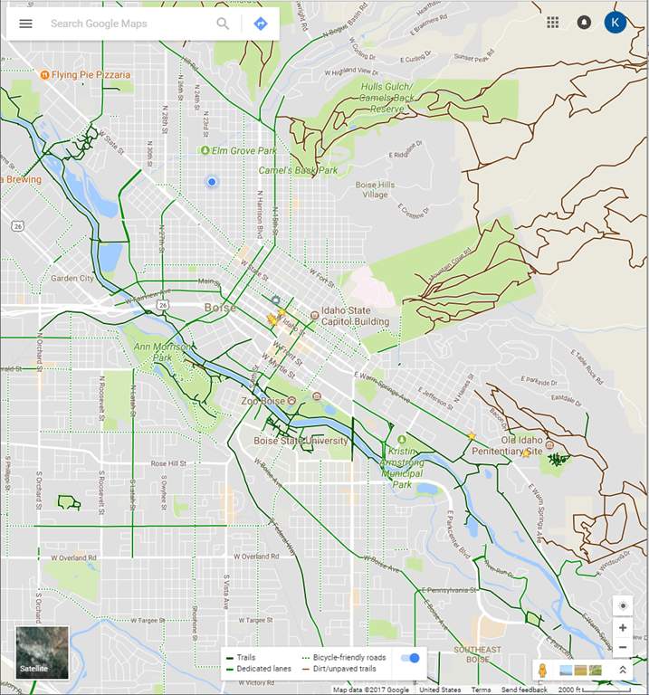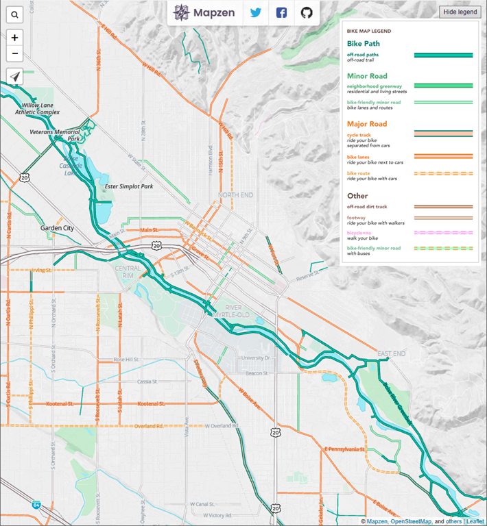 Beyond routing, Mapzen provides a map tile service that produces some beautiful maps that highlight detailed road information beneficial to cyclists. Like Google Maps, these are vector tiles that are rendered on-device, allowing significant customization in real-time without requiring an expensive round-trip to the server for a different tile. Labels that rotate independent of the map is just one example benefit. Below, compare a cyclist’s view of downtown Boise as rendered by Google and OSM. The OSM map shows more detail about the nature of the bike-friendly roads and paths, and looks better I think. Here’s more information about Mapzen’s bike maps. There are also plenty of other services out there based on OSM.