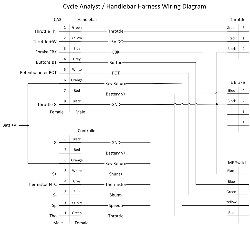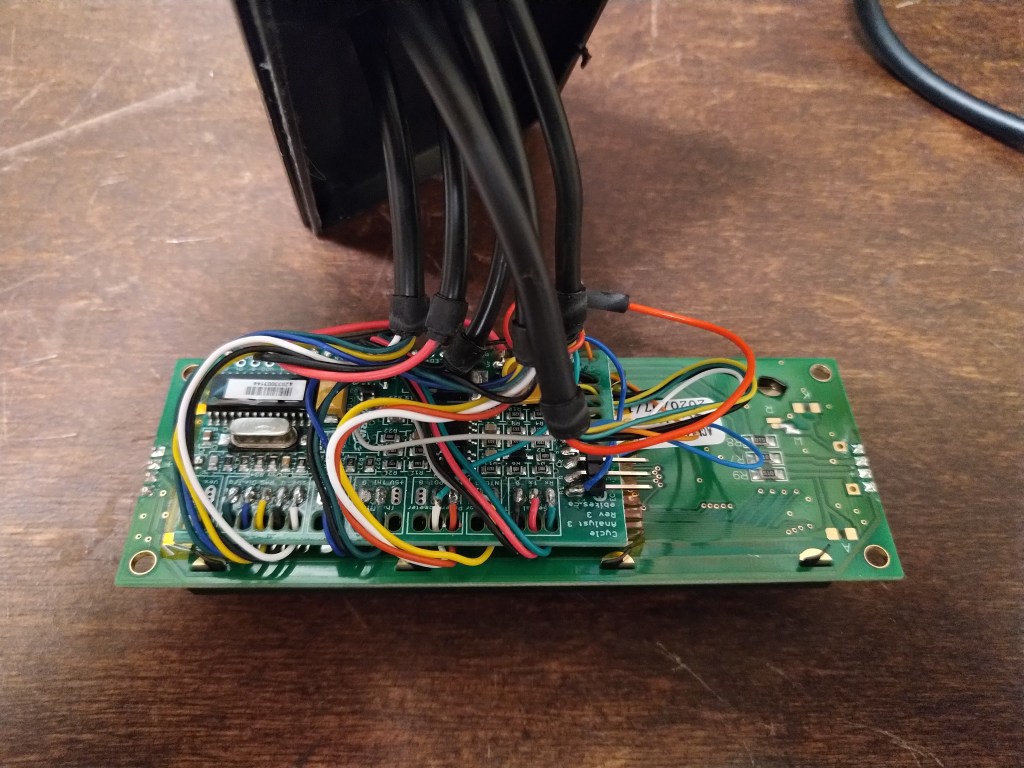 While Paul agonized over the torque adapter I installed all of the Grin components. First I made some modifications to the V3 Cycle Analyst: I removed cabling that wouldn’t be used for this install, added a cable to drive the headlight/taillight, and rewired it so the menu button on the auxiliary input and power switch activates the e-brake instead. The menu buttons on the Cycle Analyst are adequate for me and I thought it would useful to instead have a regen “paddle” like I have on my Chevy Bolt. It works quite well for this.