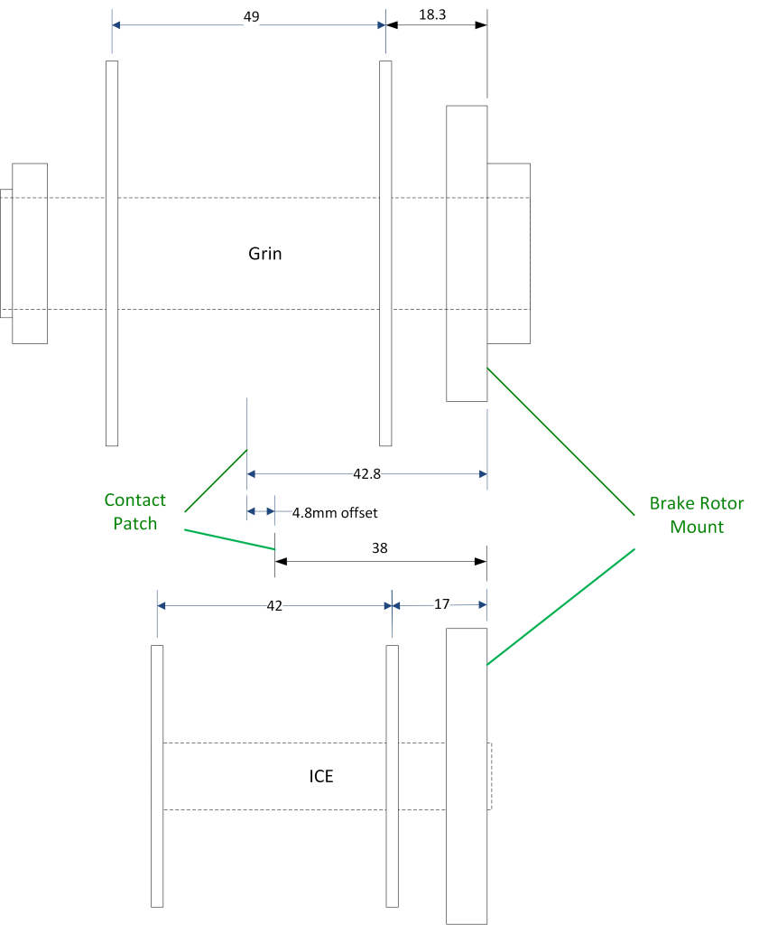 The ICE OEM axle is 12mm so I ordered Grin’s 12mm axle inserts. However the dimension of ICE’s suspension kingpost and Grin’s motor are such that the alignment of the disc brake rotor on the motor winds up about 10mm outboard of where the kingpost puts the centerline of the disc brake caliper. 10mm doesn’t seem like much but it’s way more than I was willing to shim the caliper outward to center it on the rotor. I fully expected to be testing Grin’s return policy until we discovered we could make up the 10mm by removing the 12mm axle inserts and sliding the now 20mm axle opening of the hub over the shoulder of the kingpost. Genius!