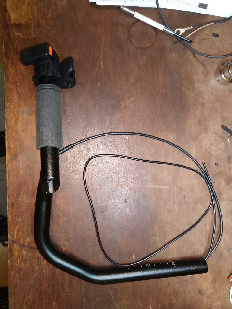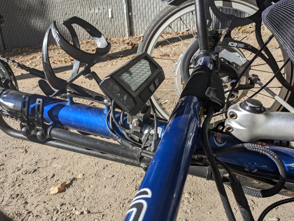 I installed the controller and battery mount low on the trike with a Terracycle battery mount. I routed wiring for all of the handlebar-mounted controls inside the handlebar tubes, multifunction controller on the left, throttle and e-brake tripwire on the right. This signal drives the same input as my modified “regen paddle” input so that either will initiate regen.