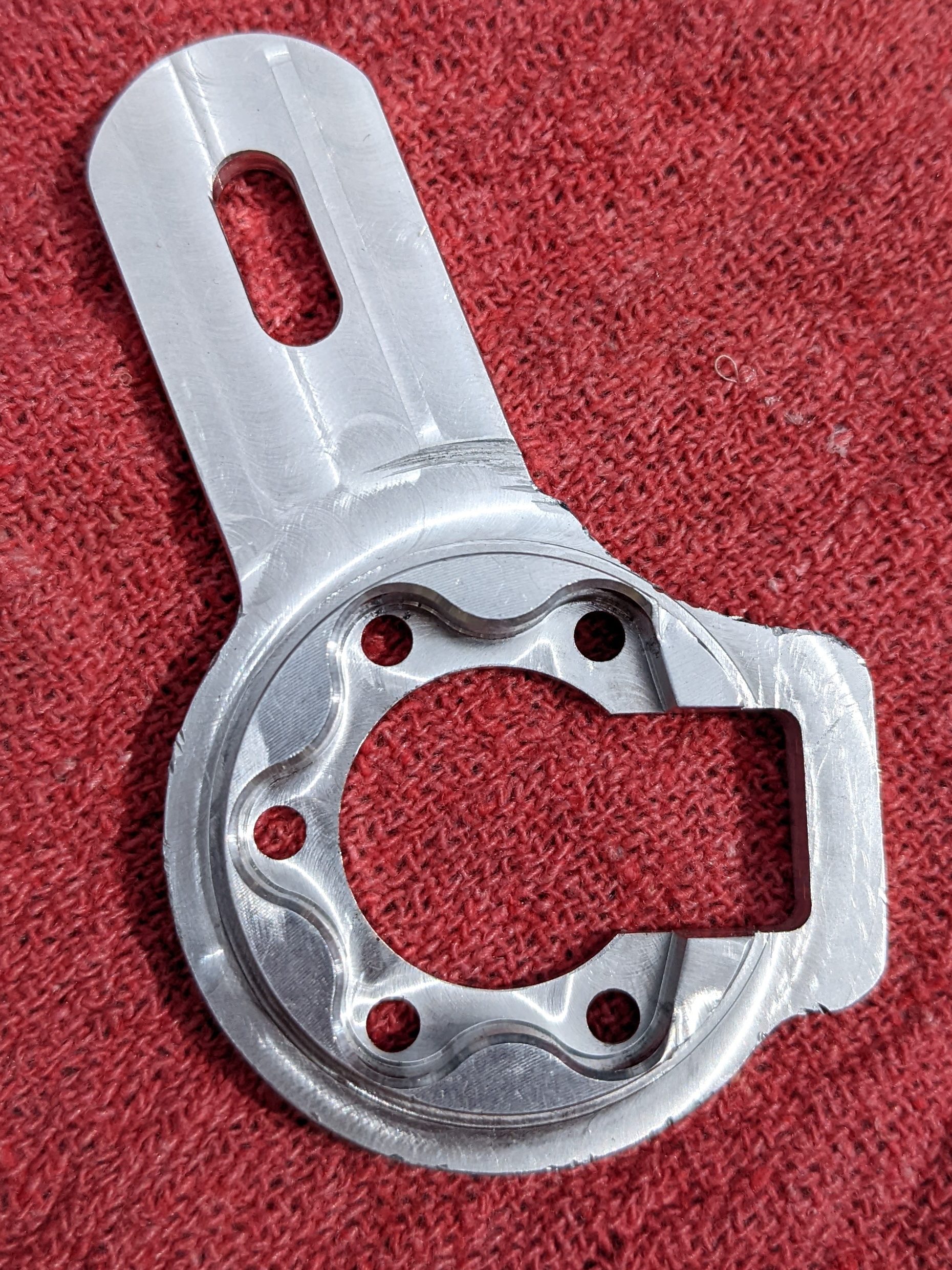 Now Paul had a new, humdinger of a project. Build up a 3D model in Freecad of our own adapter design from the dimensions on Grin’s adapter drawing, use that to program his CNC machine, and pop out a perfectly milled custom torque arm. What could be easier.